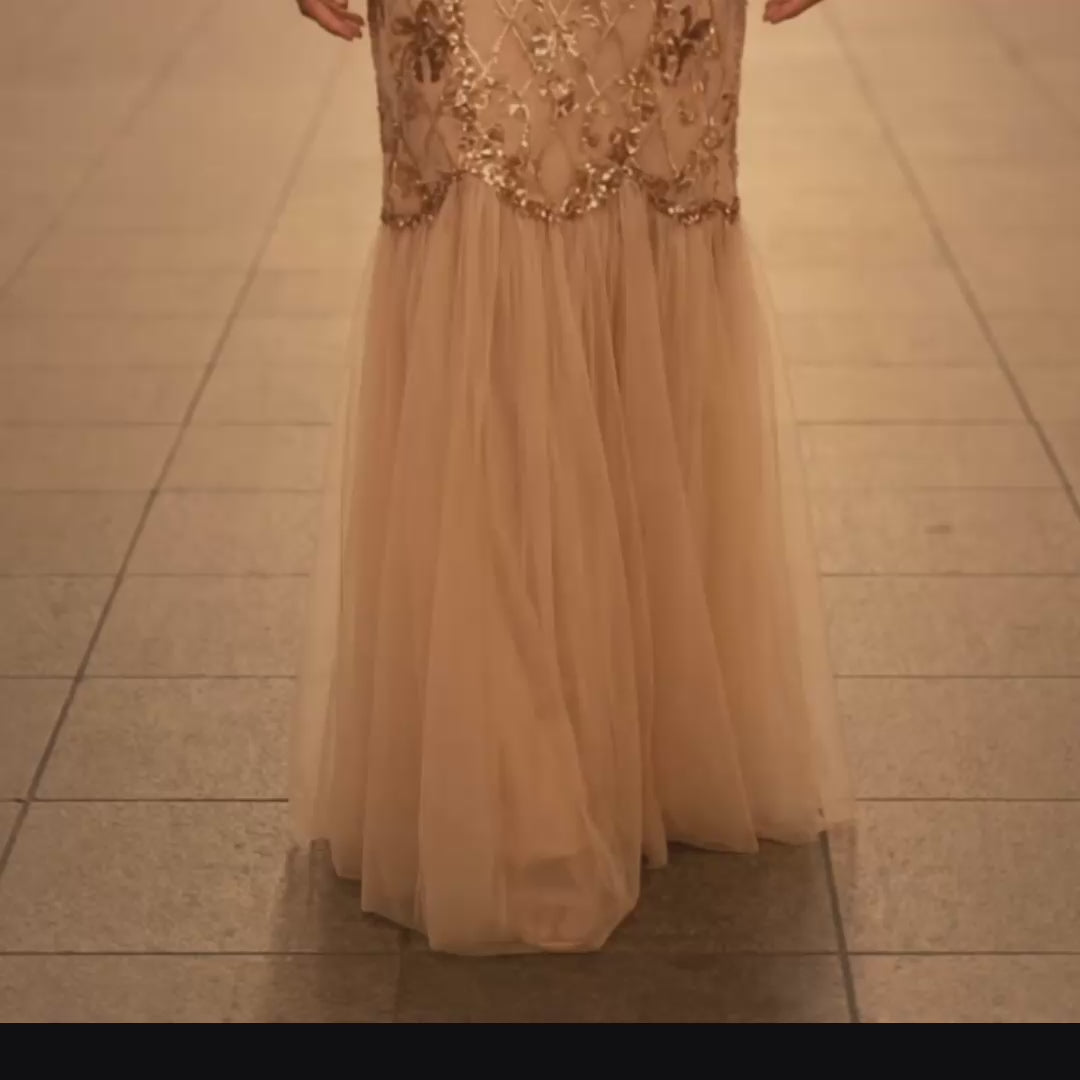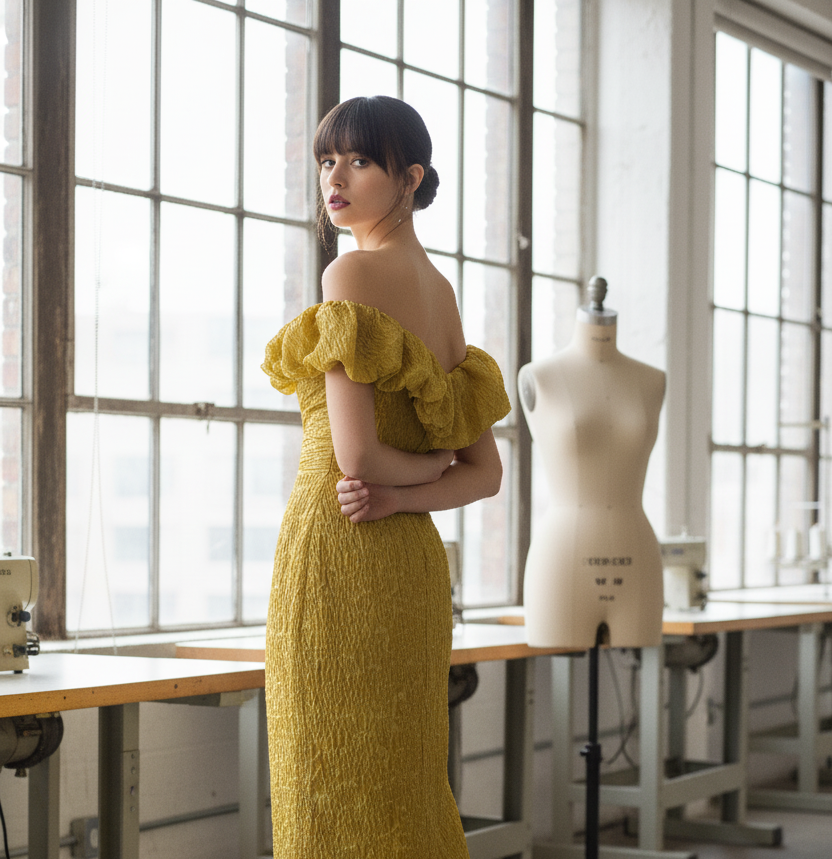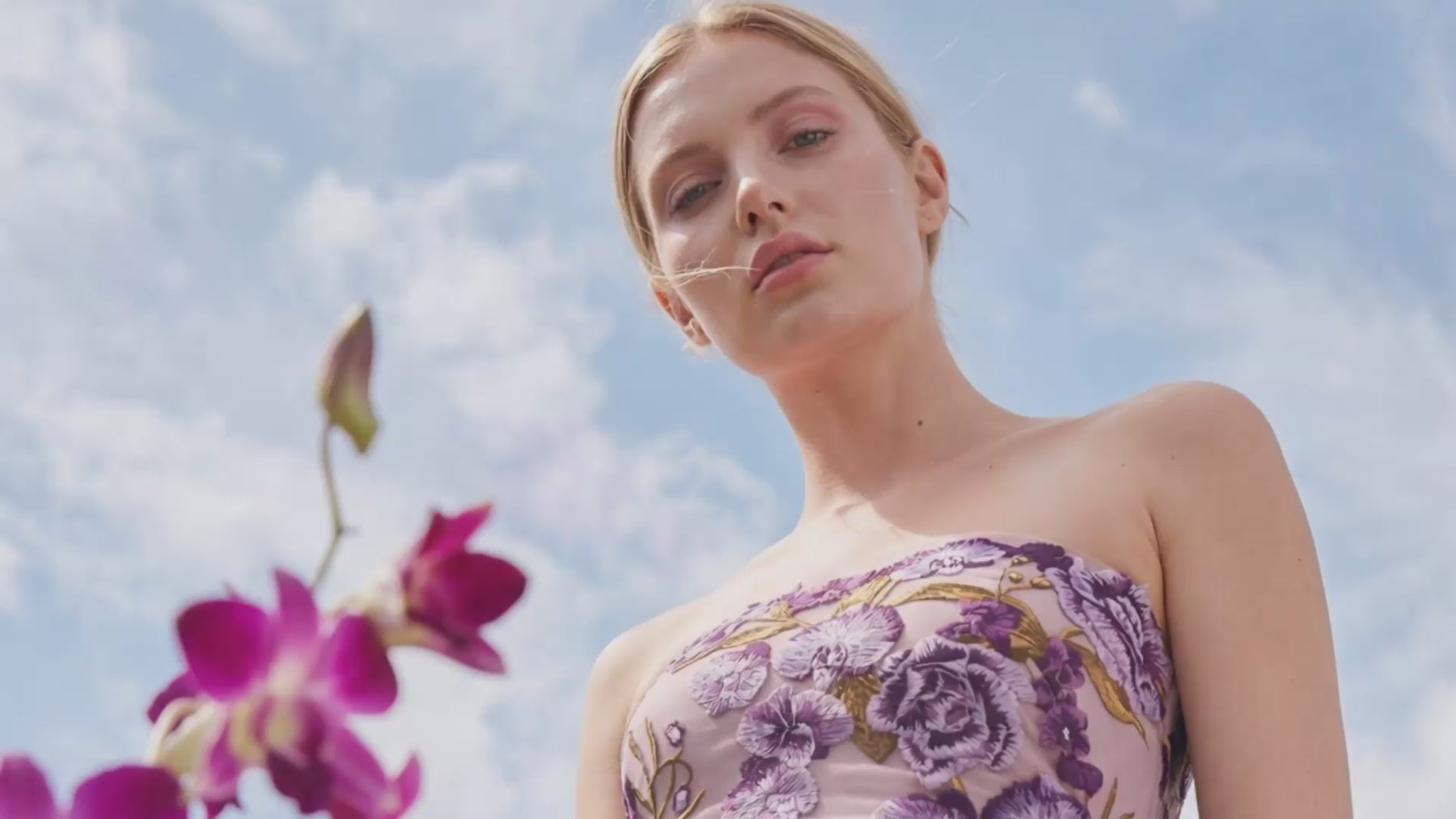 A romantic and fun-loving spring motif dances across a luxurious voile fabric, crafted using a rare atelier method that unites fine embroidery with intricate printing. The layered detailing brings depth and brilliance to the fabric, imbuing each dress with a sense of lightness, beauty, and enduring charm.