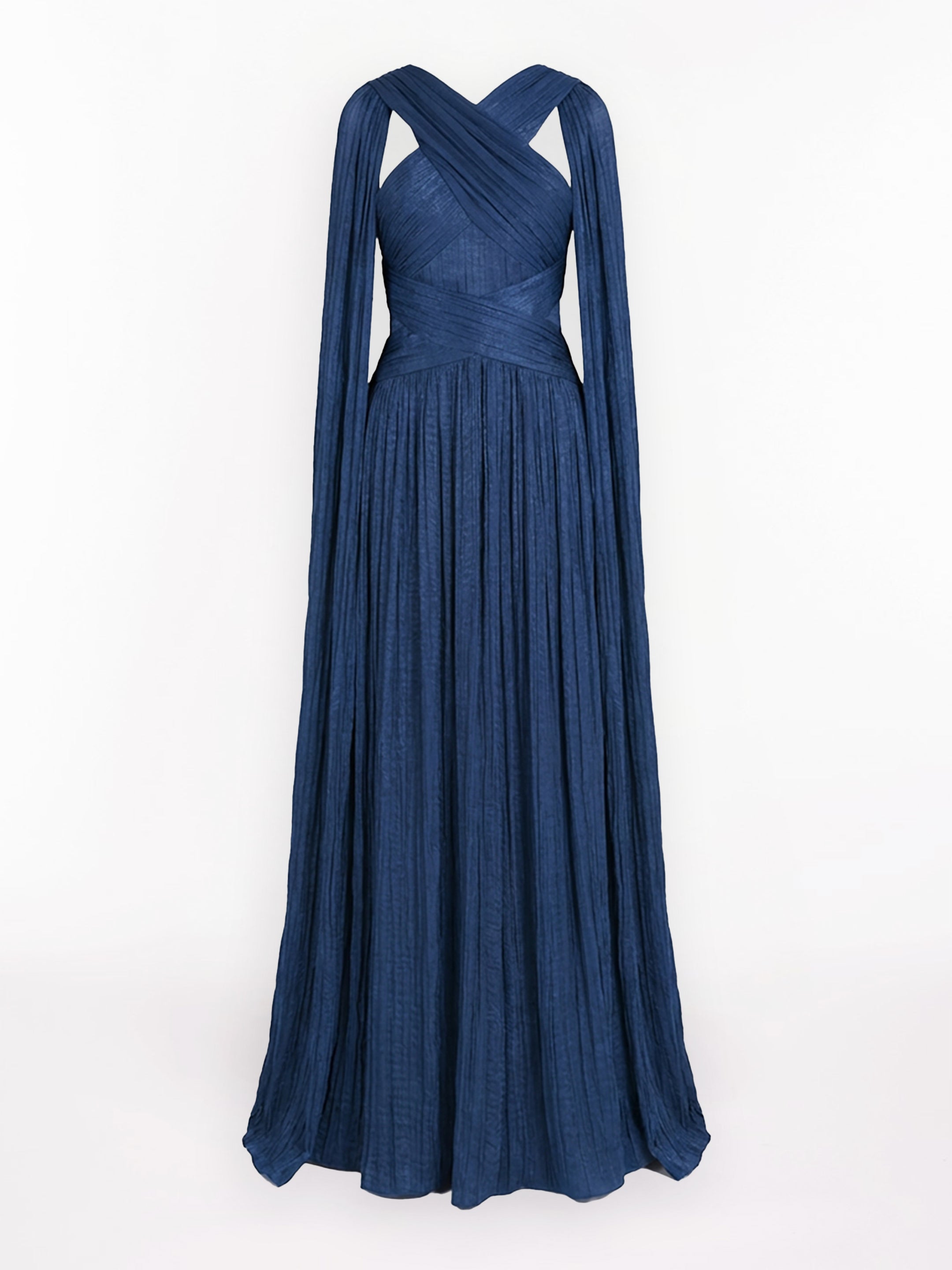 A high crisscross neckline brings sculptural definition to this pleated satin gown, finished with cascading back streamers that trail softly behind. The look is sleek and modern, tempered by the fabric’s natural fluidity.