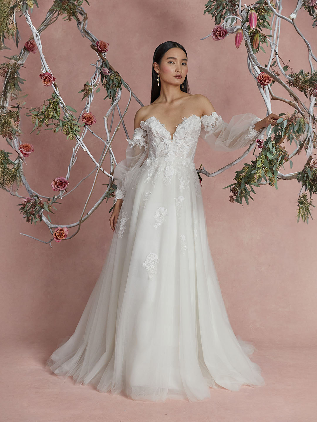 Off the shoulder v neckline bodice with billowy illusion tulle long sleeves with beaded 3D lace.