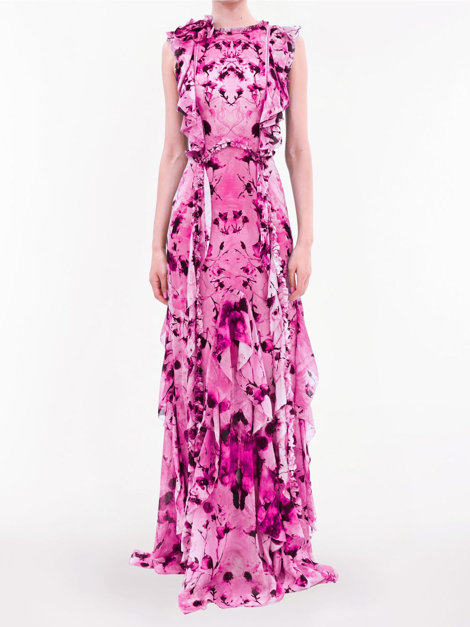 A sleeveless, high-neck floor-length maxi rendered in a painterly ink-blot floral–printed georgette, it is designed to move with effortless grace. Cascading ruffles fall through the length of the skirt, lending soft volume and fluid drama. An organically sculpted flower at the shoulder creates an artful focal point, while subtle gathered ruffles at the waist and neckline delicately frame the silhouette, bringing the design quietly to life.