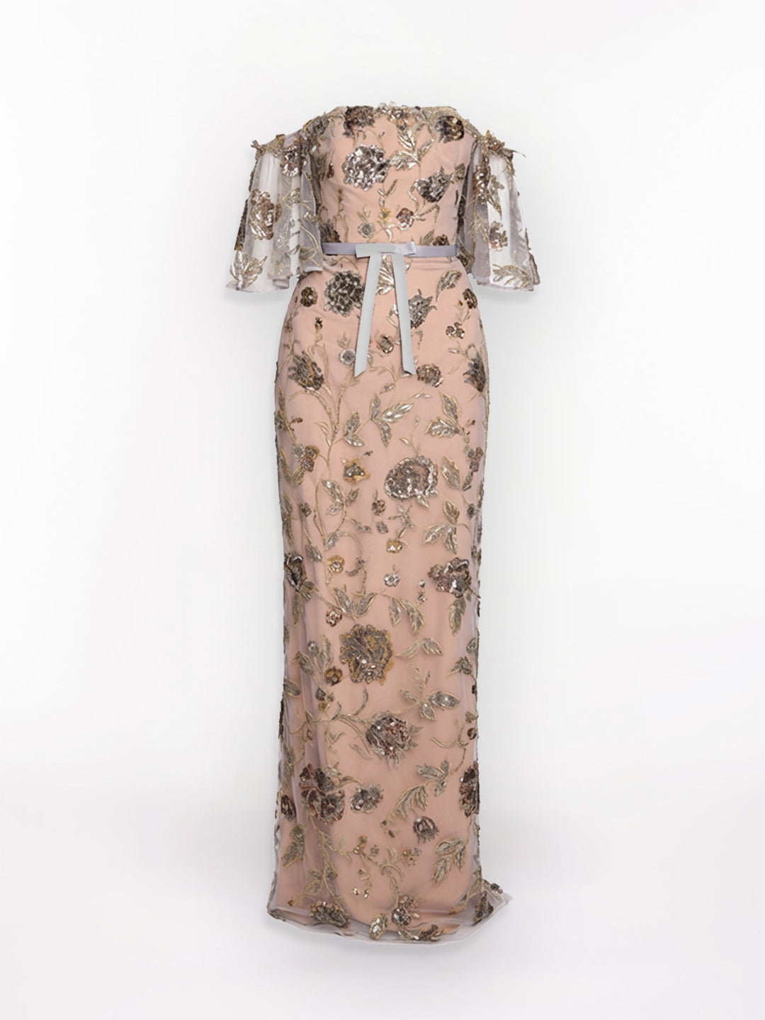 Made of sheer illusion tulle adorned with hand-beaded embroidery, this off-the-shoulder column gown features delicate flutter sleeves and a floor-length silhouette that skims the body with soft, subtle movement.