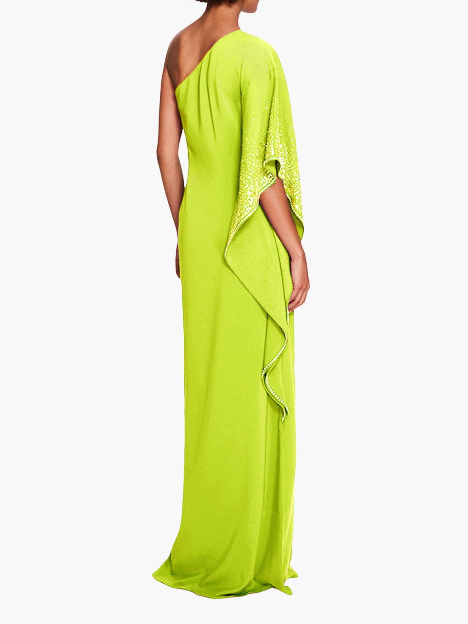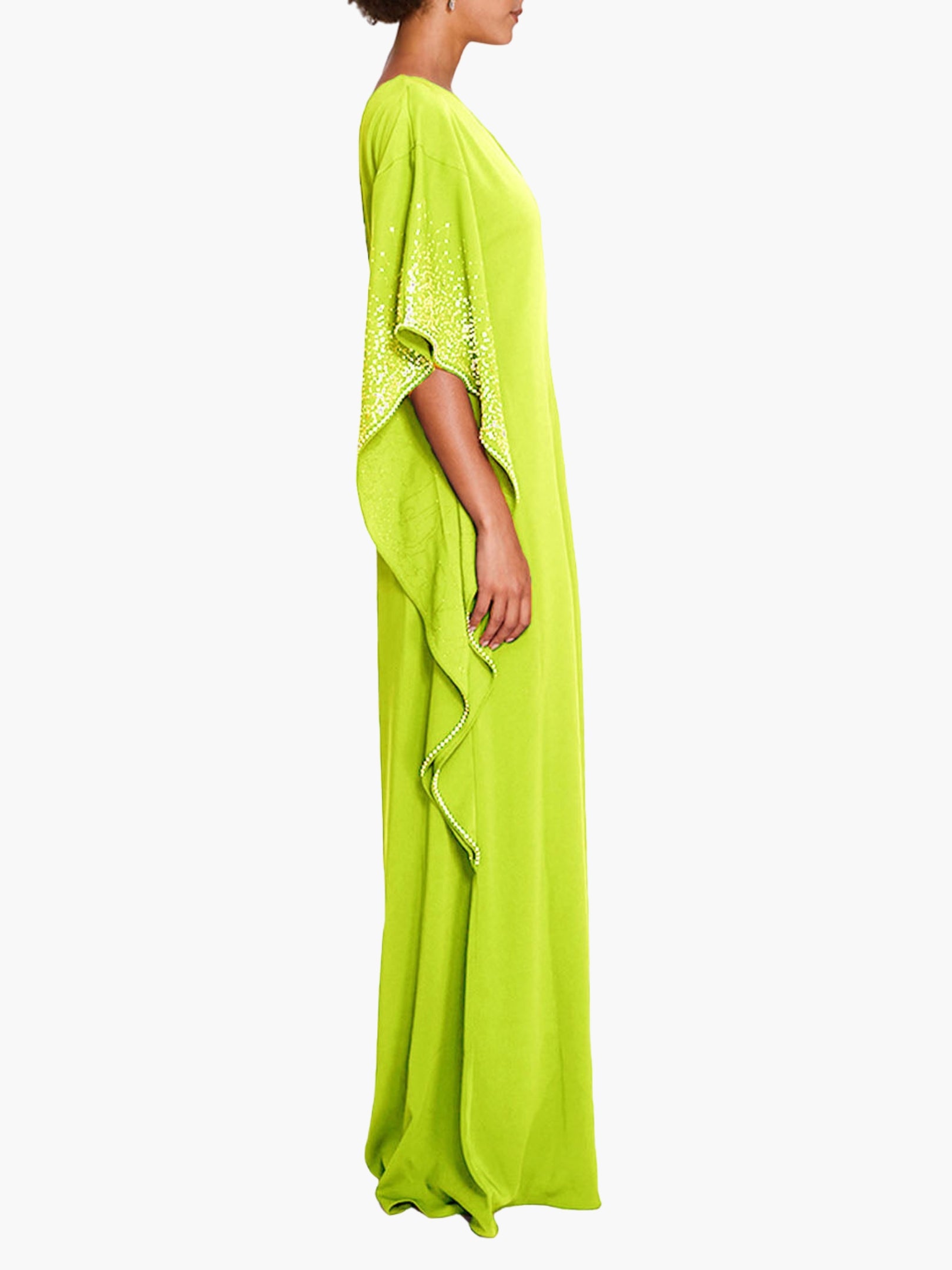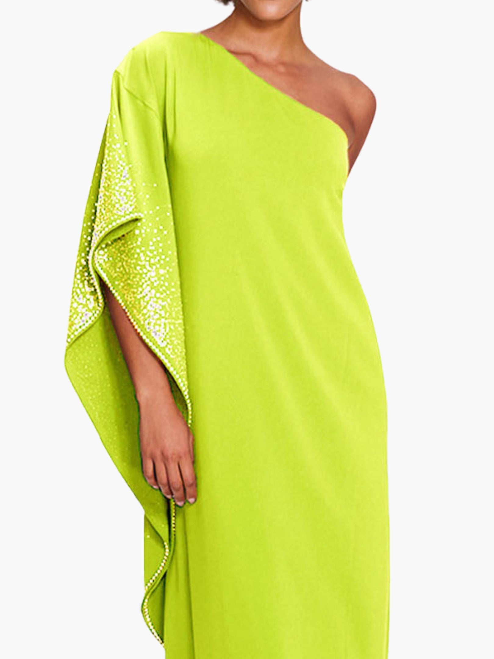 The One Shoulder Kaftan is a one shoulder long sleeved crepe kaftan with glitter detailing on the sleeve.