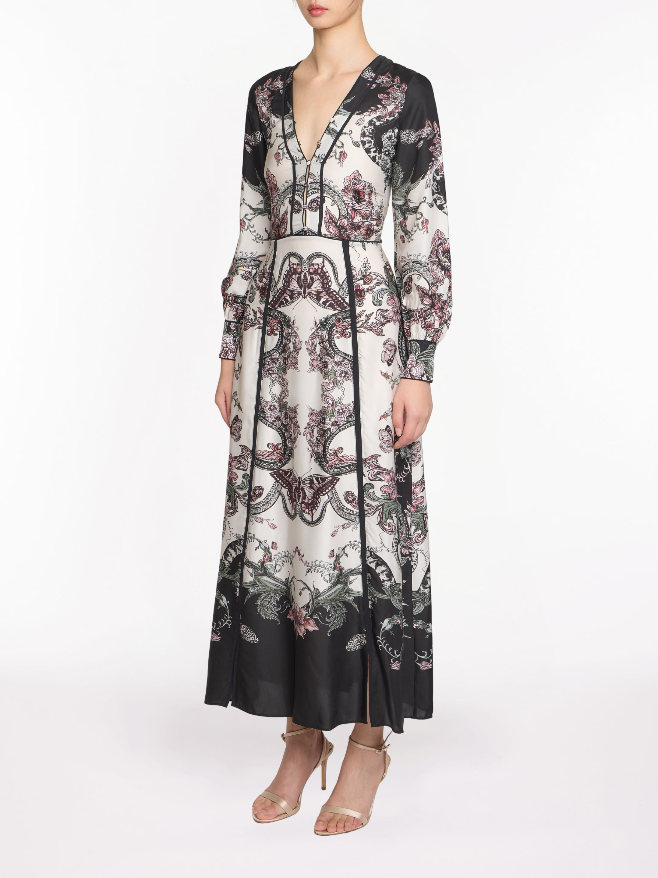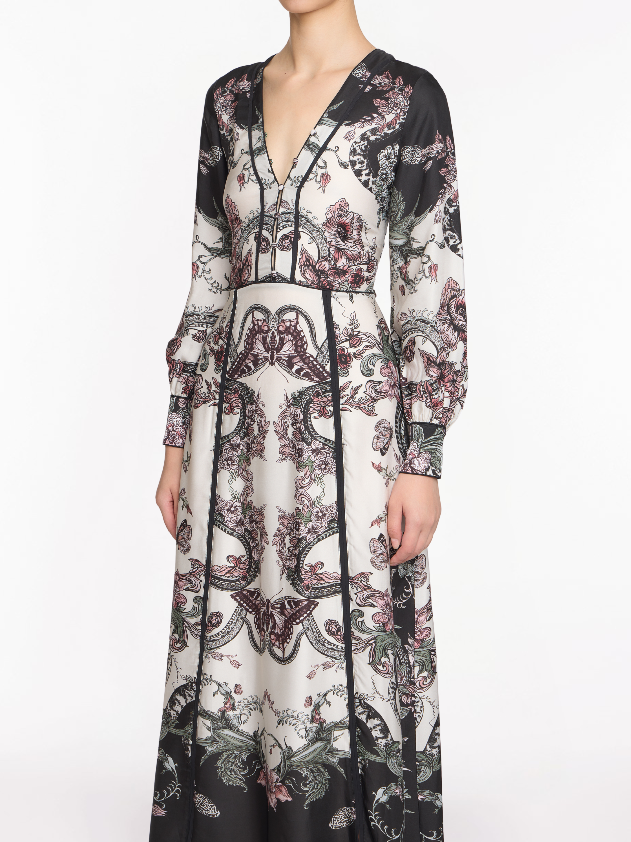 The Corded Twill Midi Dress features a V-neckline, long sleeves, and chiffon corded accent piping. Crafted from viscose twill, the relaxed fit dress is complete with front leg slits and a rope belt for added texture and shape.