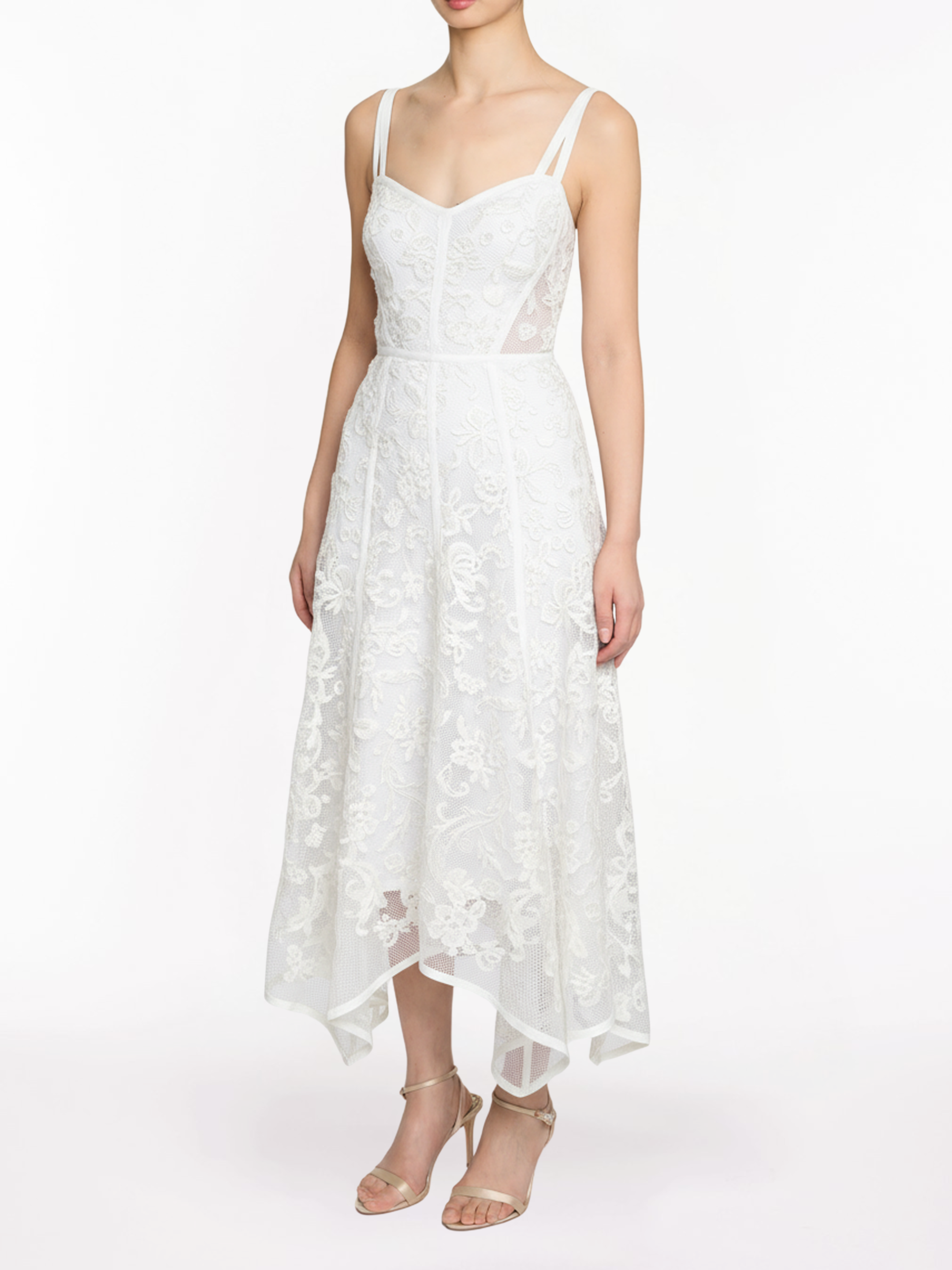 In corded lace and embroidered mesh, this bustier midi dress is finished with ribbon straps and a softly uneven handkerchief hem that falls just below the knee. Textured ribbon trim outlines the bodice, adding structure and contrast to its romantic design.
