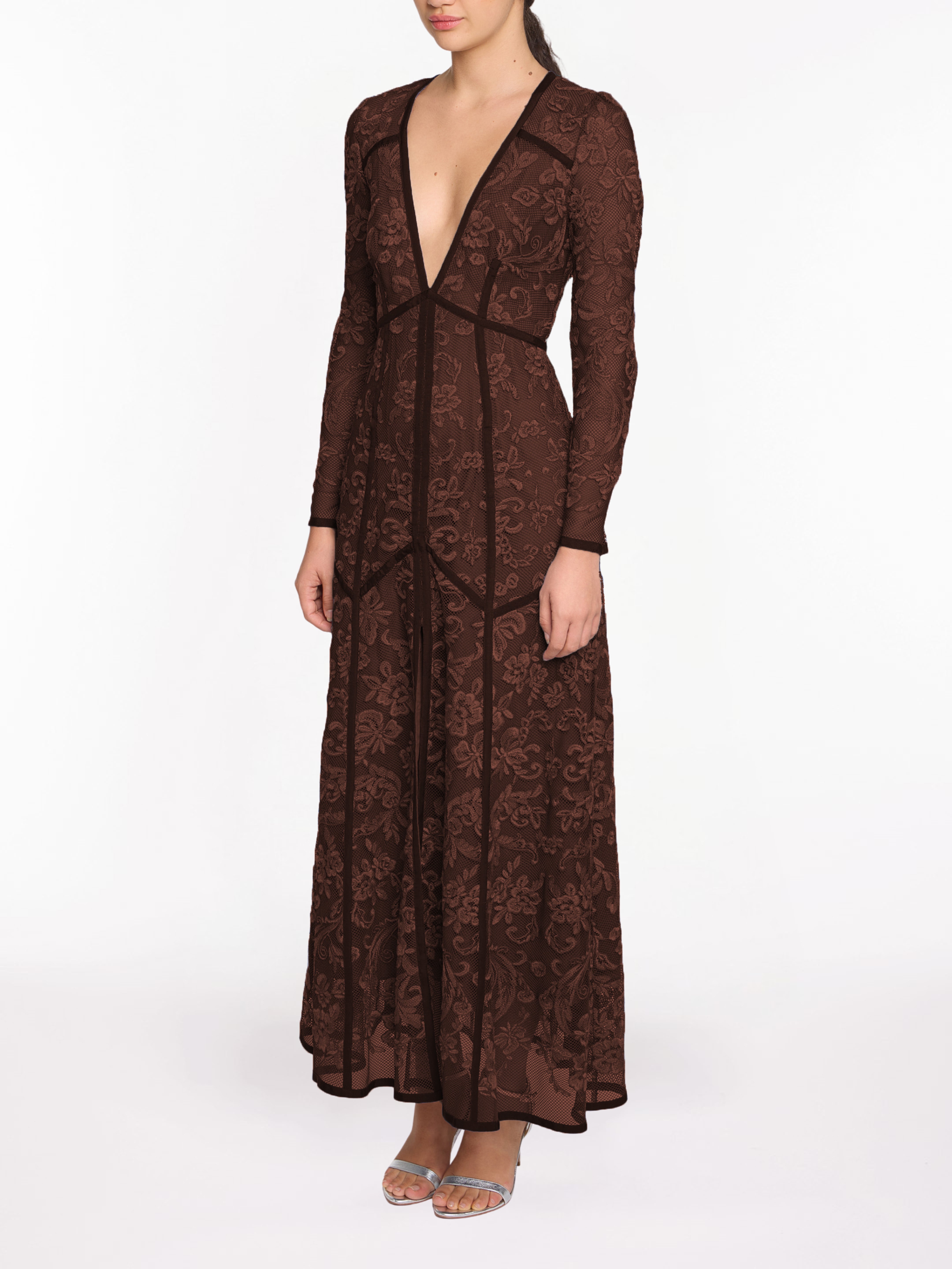 This deep V-neck maxi dress pairs structured corded lace with the lightness of embroidered mesh. Covered buttons and ribbon trim lend quiet refinement, balancing texture with a sleek, elongating silhouette.