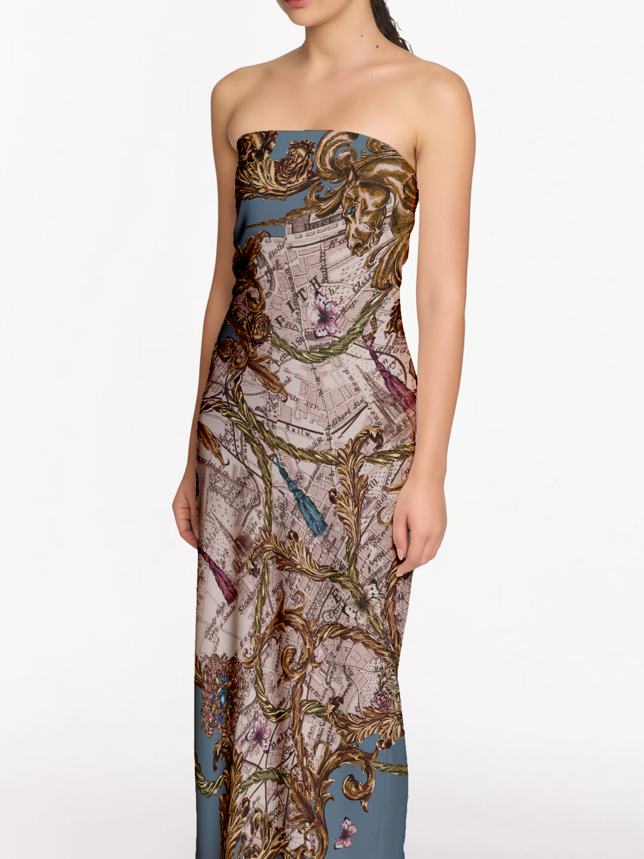 Bias-cut from printed viscose twill, this strapless midi dress skims the figure with effortless fluidity. A coordinating belt highlights the waist for a clean, modern finish.