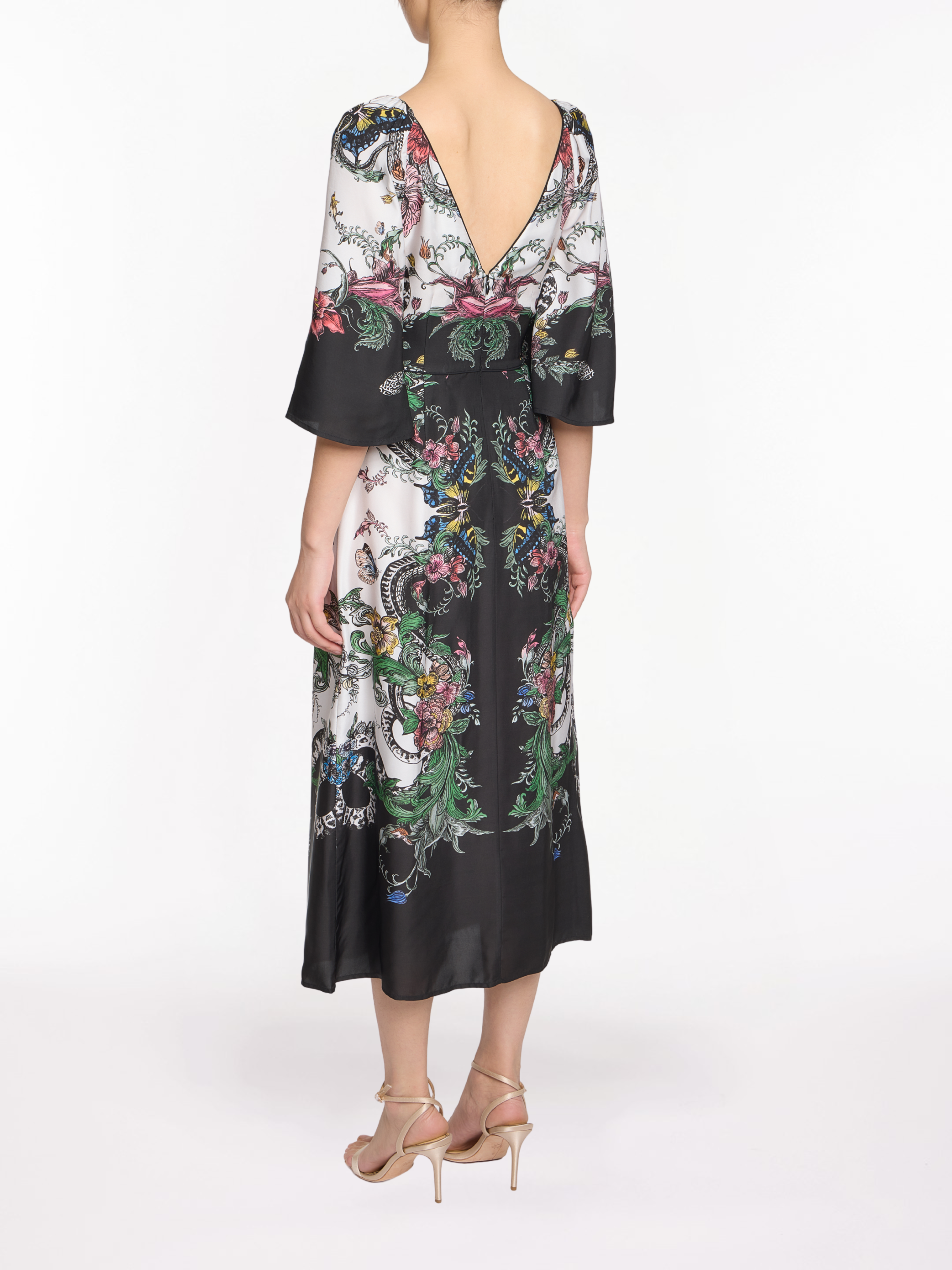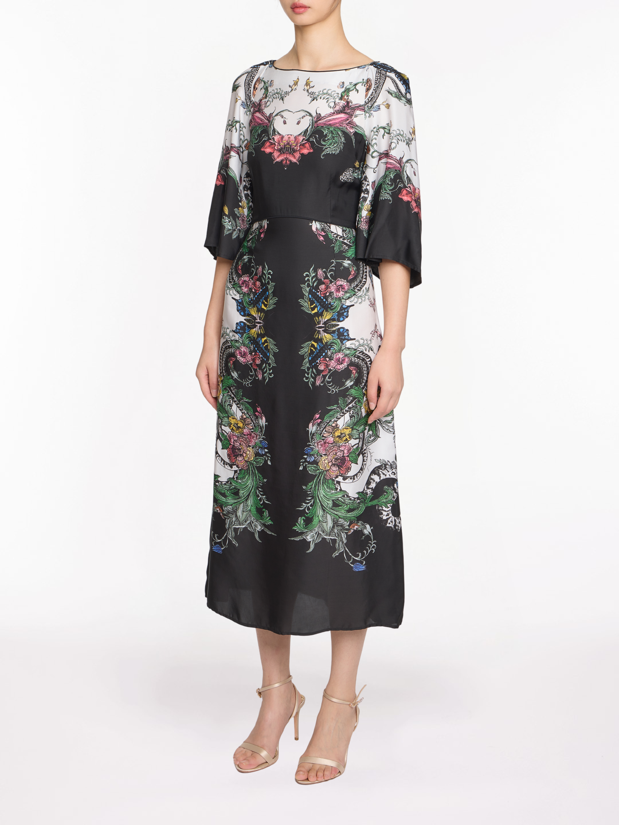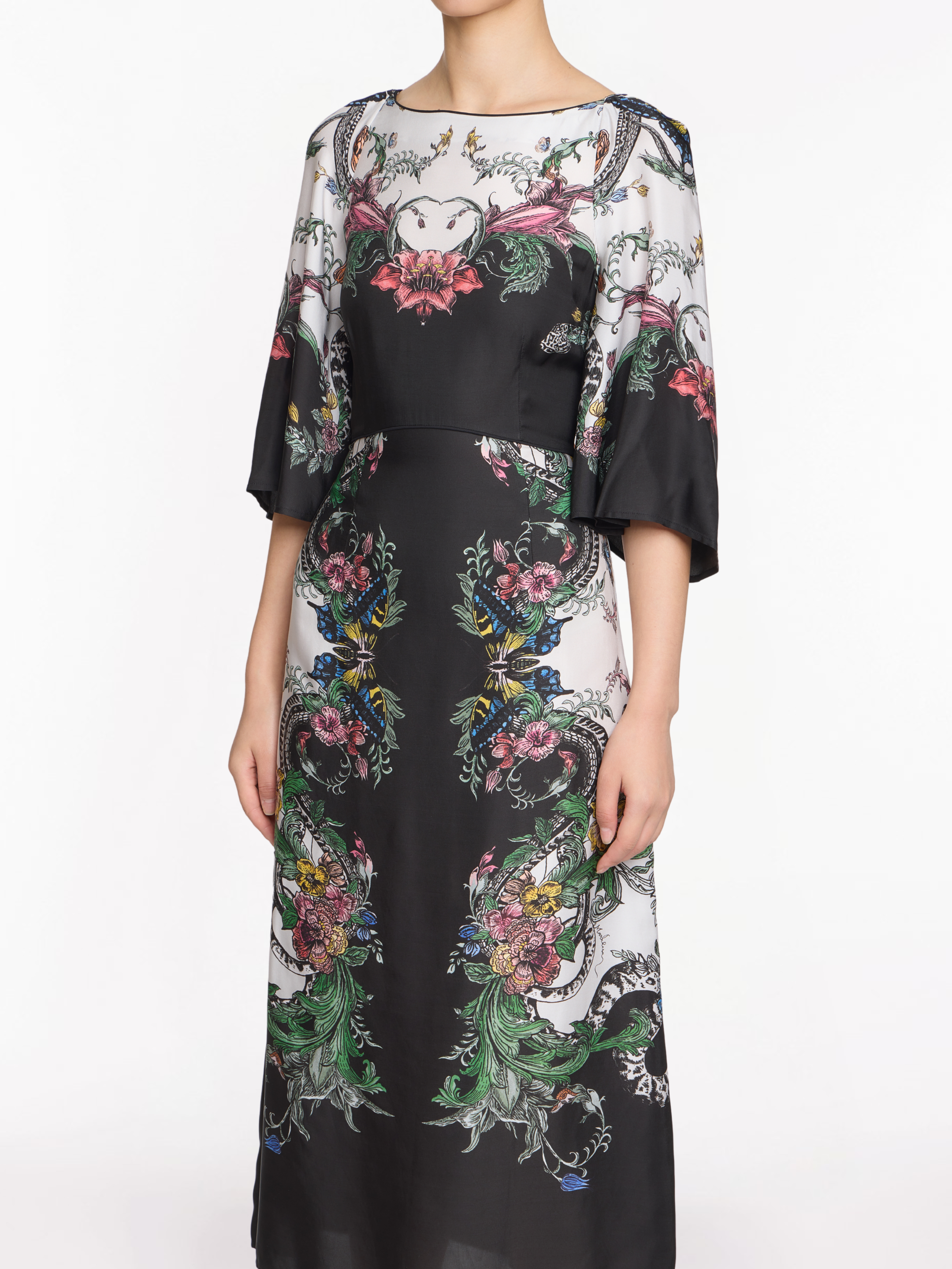 Crafted from viscose twill and chiffon with corded piping, the Billowy Twill Empire Dress features an empire A-line silhouette, high neckline, billowy sleeves, and finished with refined accent piping.
