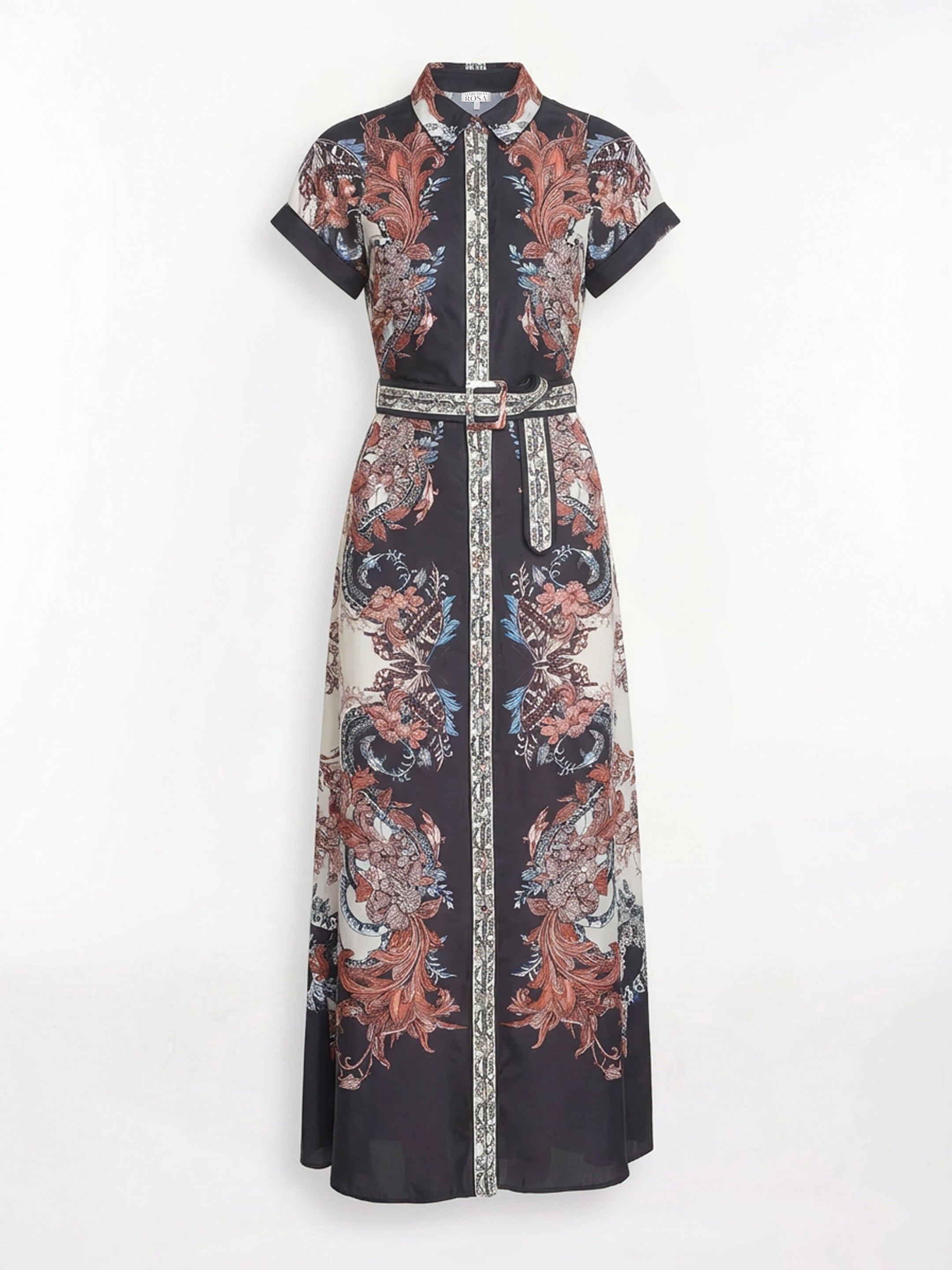 Crafted from viscose twill, the Belted Twill Shirt Dress features an a-line silhouette with covered buttons, contrasting chiffon corded piping, and a coordinating printed belt for a coordinated and refined finish.