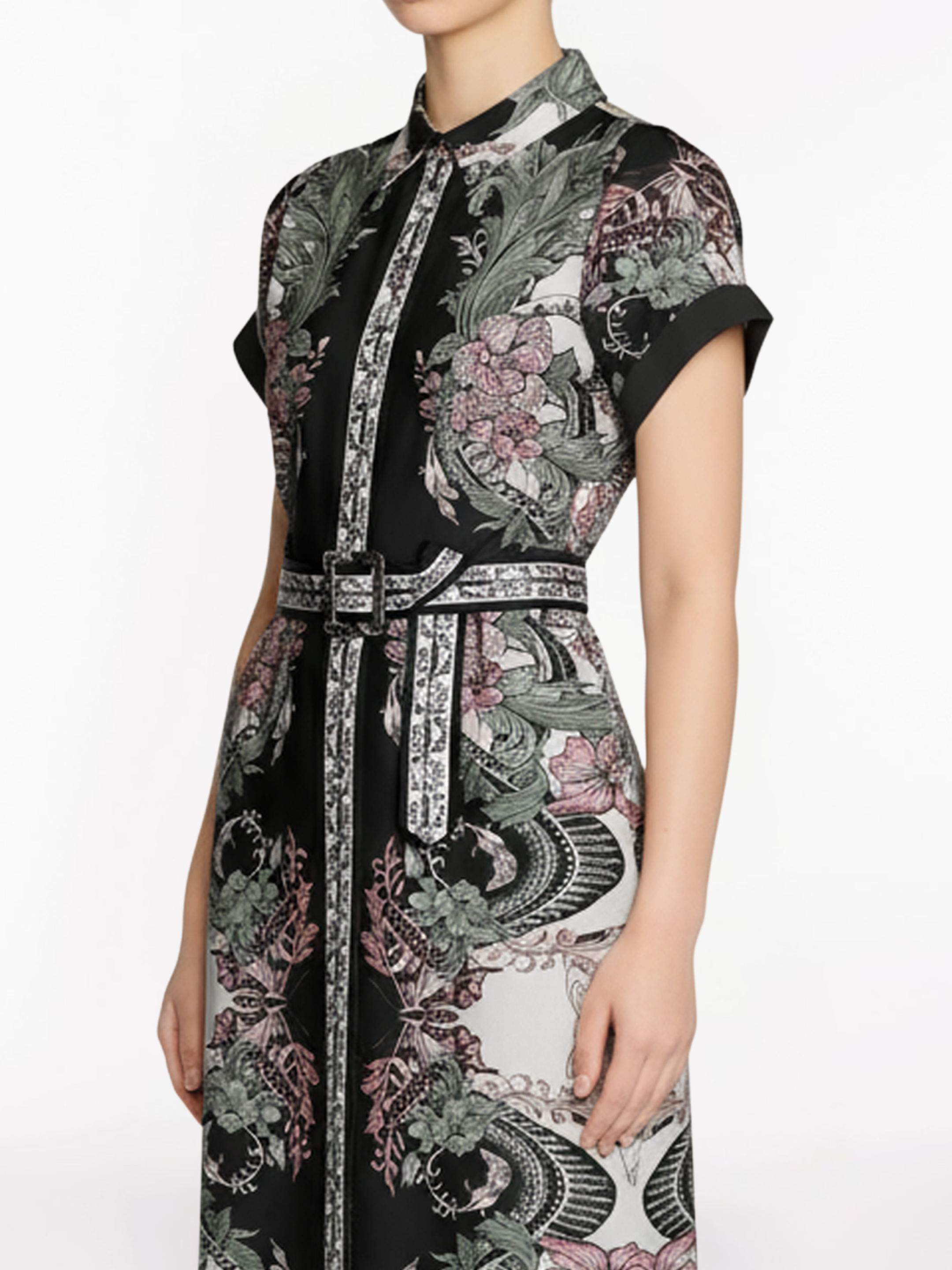 Crafted from viscose twill, the Belted Twill Shirt Dress features an a-line silhouette with covered buttons, contrasting chiffon corded piping, and a coordinating printed belt for a coordinated and refined finish.