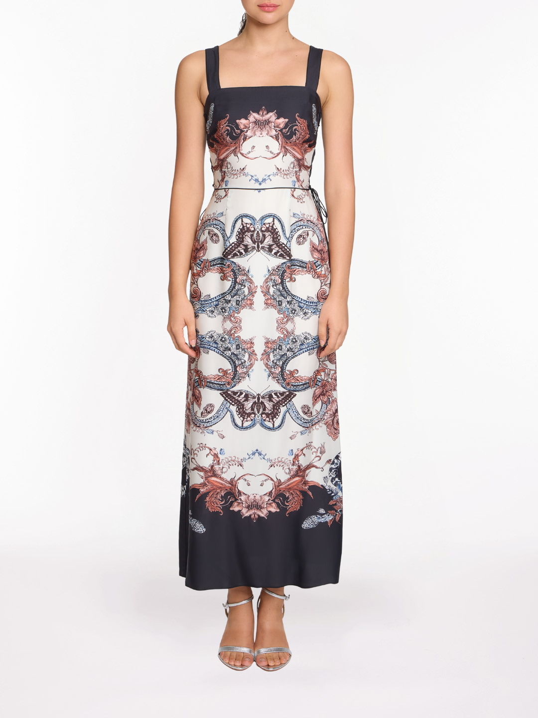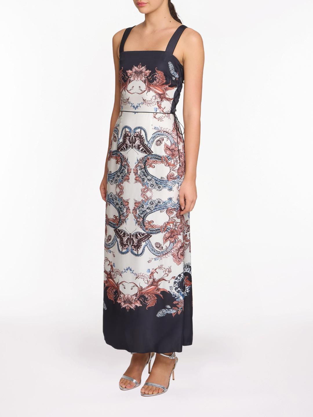 The Sleeveless Twill Midi Dress features a square neckline, side lacing, and back slit. Crafted from lightweight viscose twill, the mirrored patterned midi dress is detailed with chiffon corded piping for a refined finish.