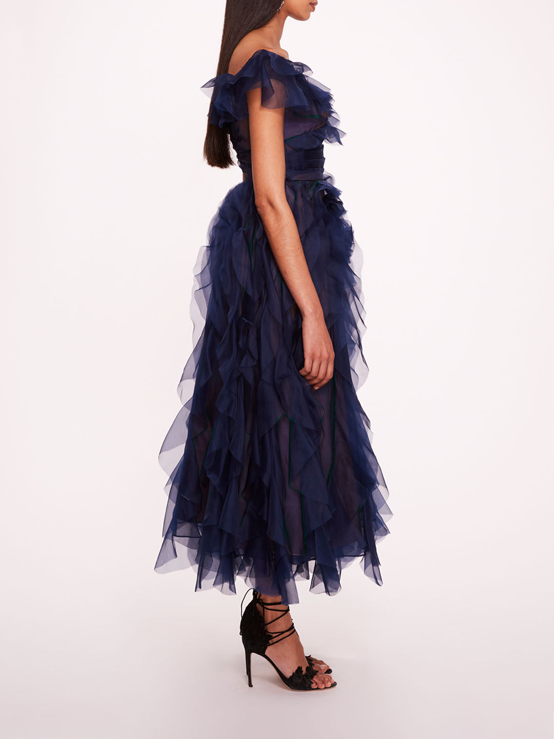 The Matte Organza Midi Dress features a v-neckline and a criss-cross ruffle detail that frames the neckline. The off-the-shoulder sleeves and raw-edge ruffled skirt adds texture and movement, creating a striking balance of sophistication and modern flair for your next cocktail event.