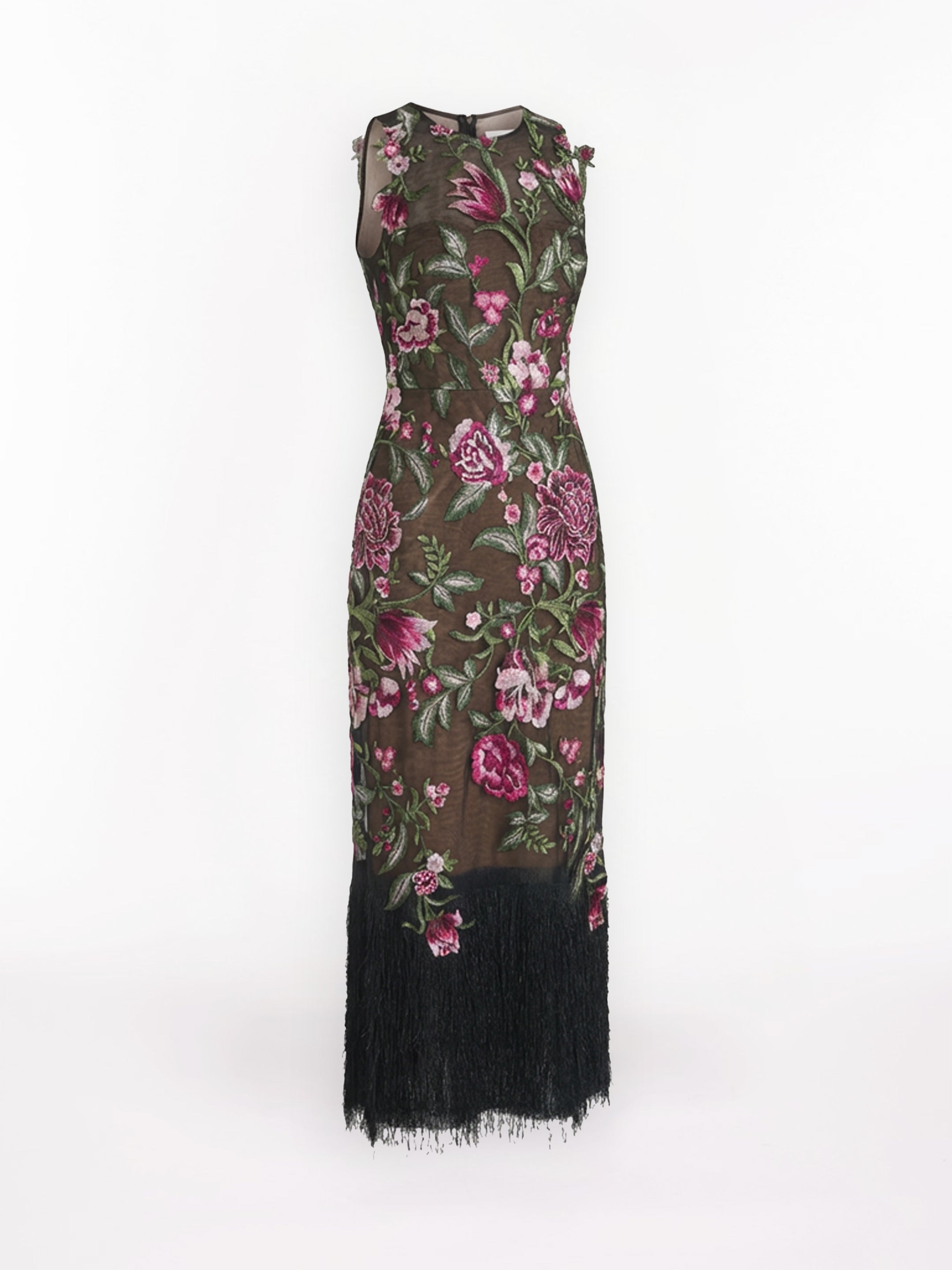 The Embroidered Fringe Midi Dress features a clean column silhouette, round neckline, and sleeveless bodice. Crafted with delicate tulle, the cocktail dress is complete with Intricate 3D floral embroidery and dynamic fringe along the skirt hem.