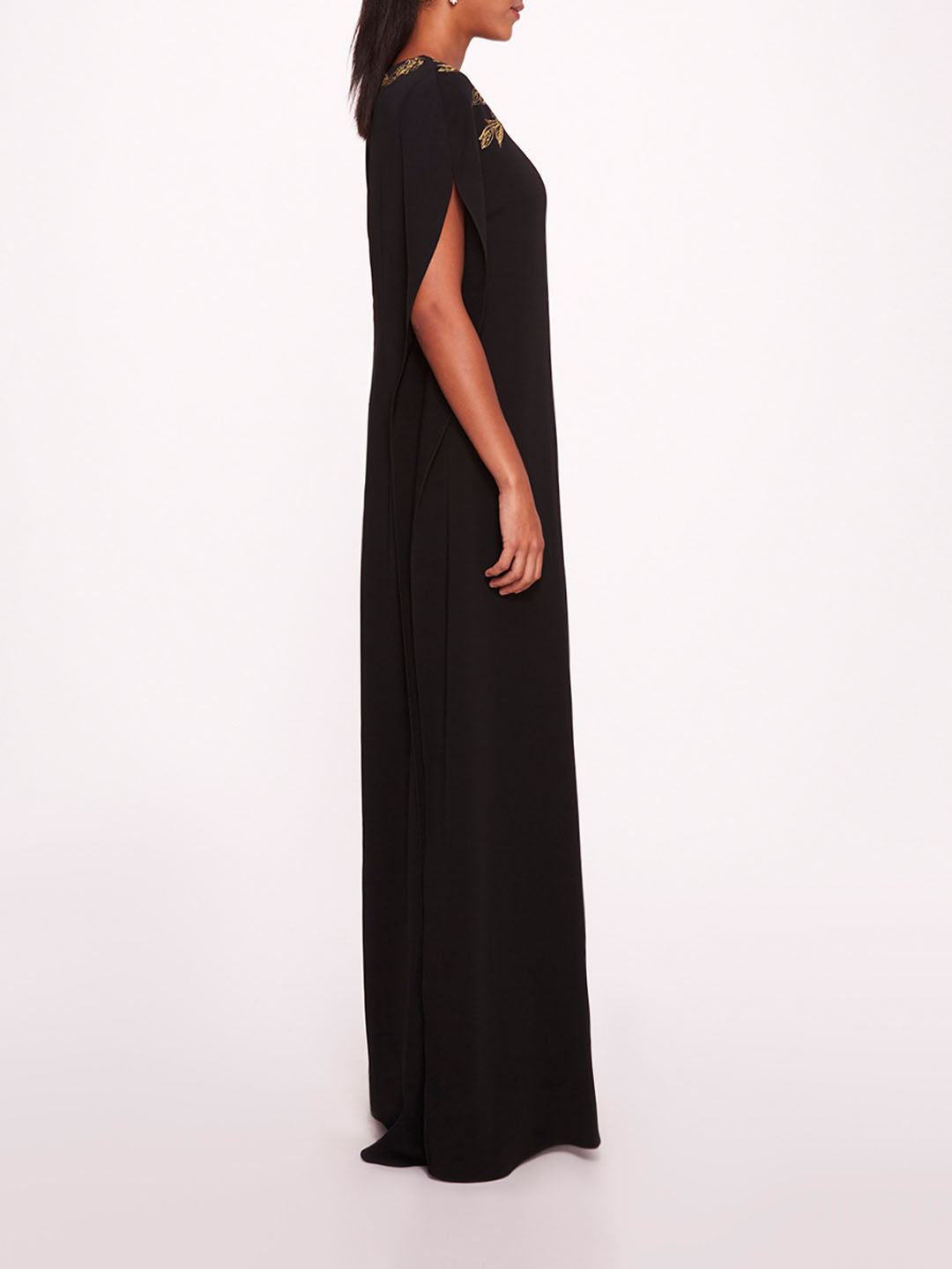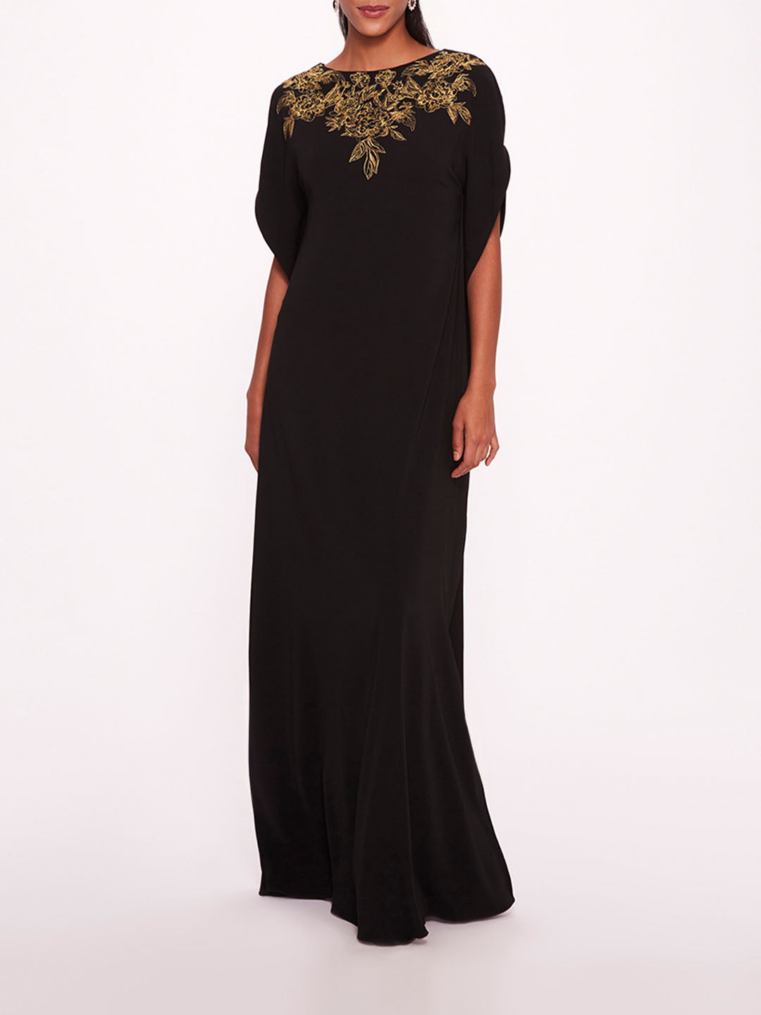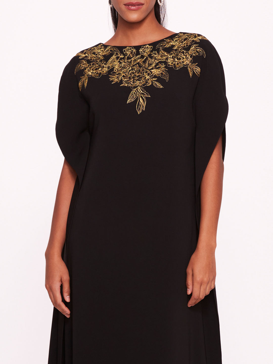 The Embroidered Crepe Kaftan is a lightweight crepe kaftan with floral neckline