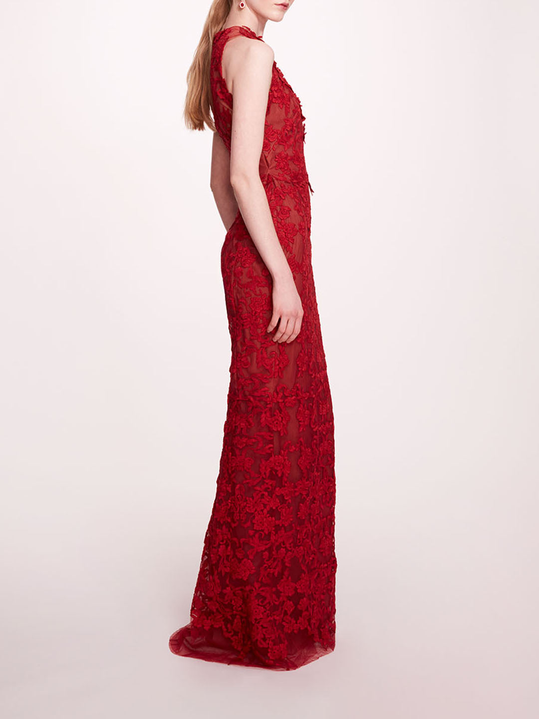 Exude timeless elegance in the Corded Column Gown, crafted from exquisite corded lace and adorned with delicate floral appliqués. This sleeveless silhouette gracefully hugs your figure, creating a stunning profile for any formal occasion.