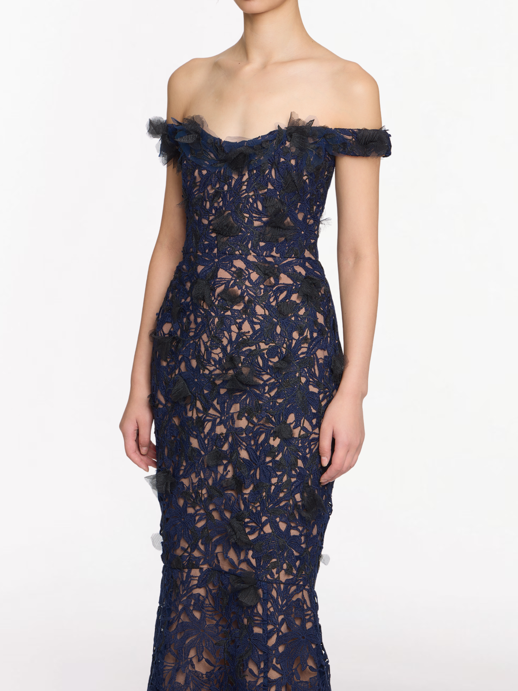 A vision of modern romance, this Guipure Lace Gown highlights a sculpted off-the-shoulder neckline and dimensional 3D petals that bloom across with intricate lacework. The design follows the body’s natural lines before unfolding into a gentle flare that allows for soft movement.