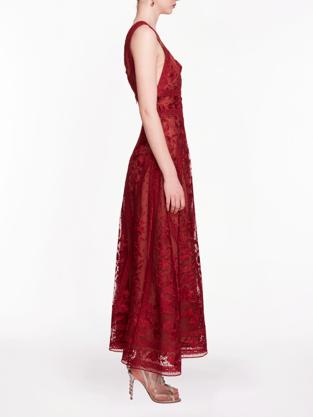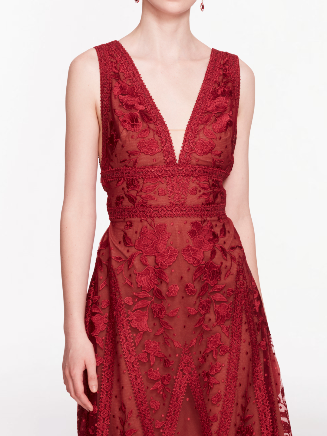 Capture the essence of elegance with the Spear Garden Midi Dress, featuring a sleeveless design and a deep v-neckline. Adorned with exquisite spear garden embroidery on delicate tulle, this cocktail dress brings a touch of whimsy and sophistication to your wardrobe.