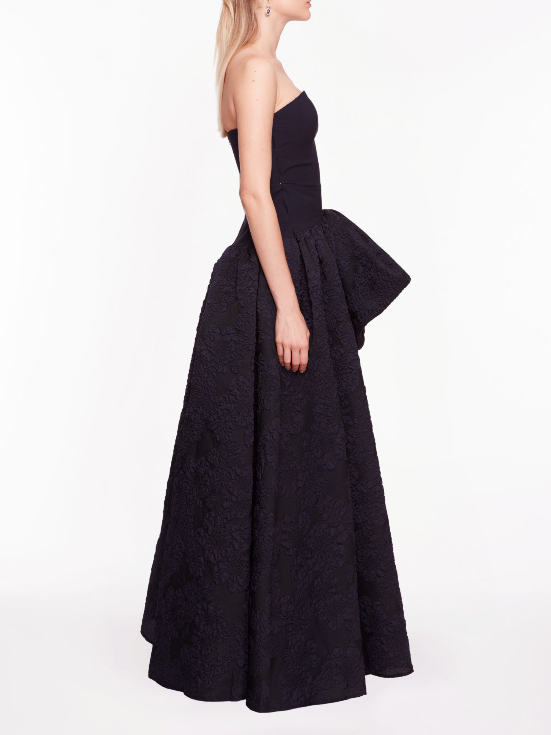 The Calathea Gown is a strapless gown designed with calathea cloqué detailed on 4-way stretch crepe. The ballgown features a high slit and dramatic bow.