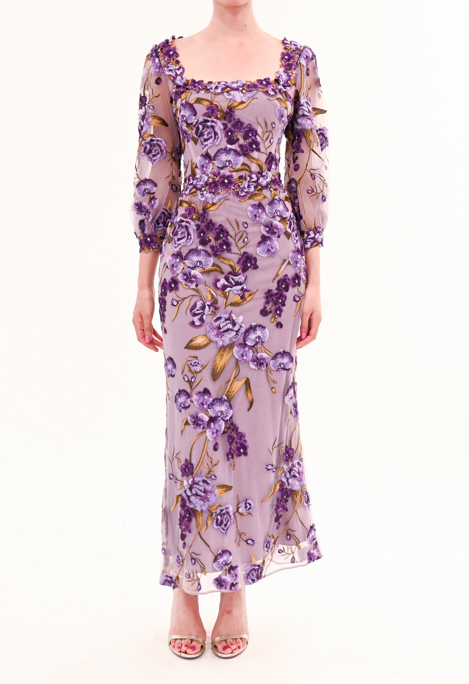 The Bronix midi gown is crafted in illusion tulle, embroidered with a hand-drawn botanical motif of orchids and roses. Designed with a clean square neckline and long bishop sleeves, the fitted silhouette offers a refined balance of structure and softness. Romantic yet modern, the dress highlights the body with understated elegance and artful detail.