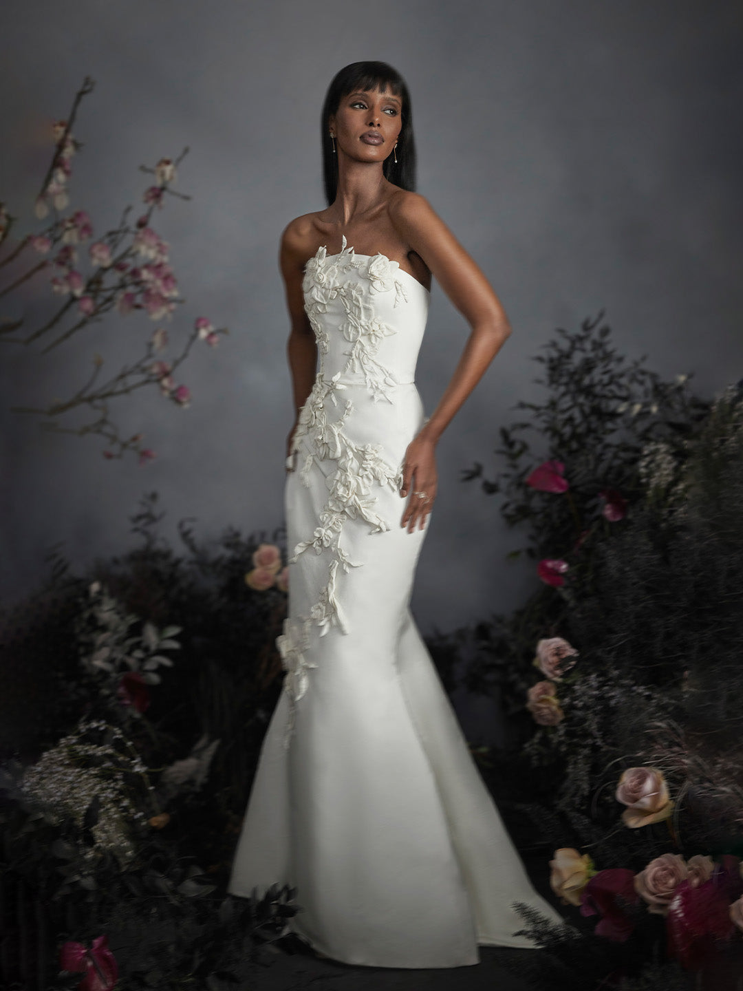 Strapless silk radzmir fit to flare gown adorned with 3D orchid vines.