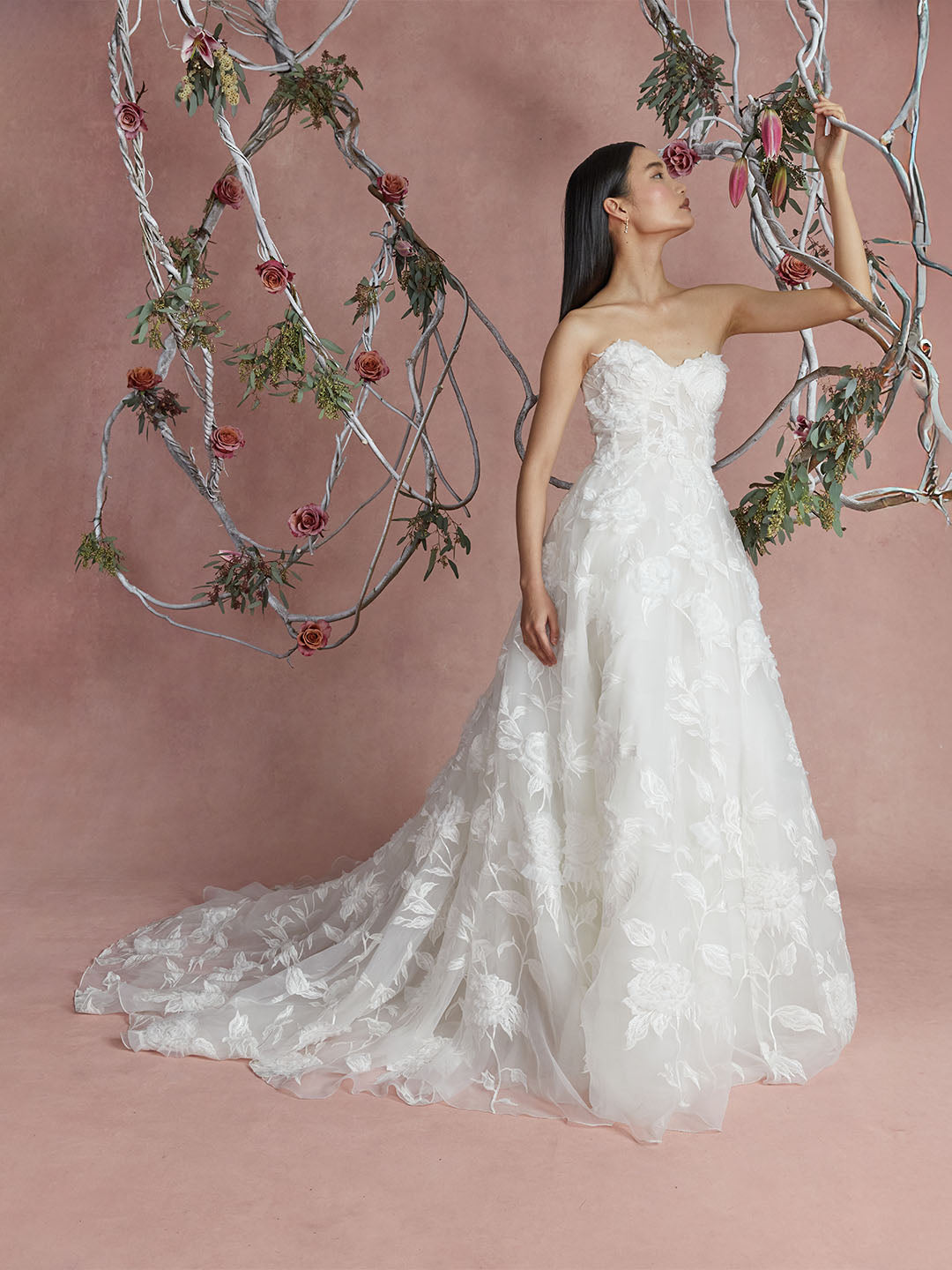 Strapless ballgown in organza floral threadwork embroidery with texture.