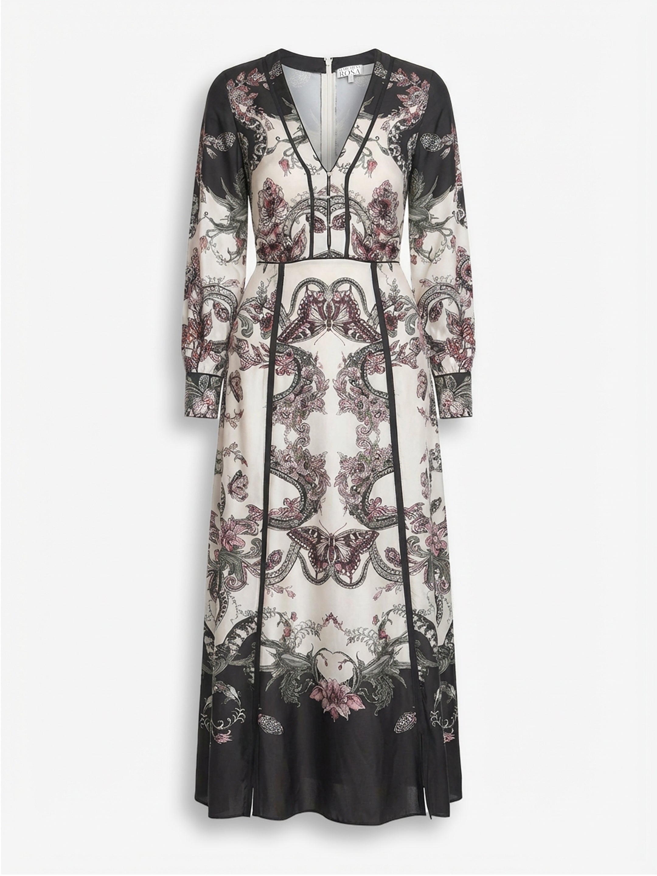 The Corded Twill Midi Dress features a V-neckline, long sleeves, and chiffon corded accent piping. Crafted from viscose twill, the relaxed fit dress is complete with front leg slits and a rope belt for added texture and shape.