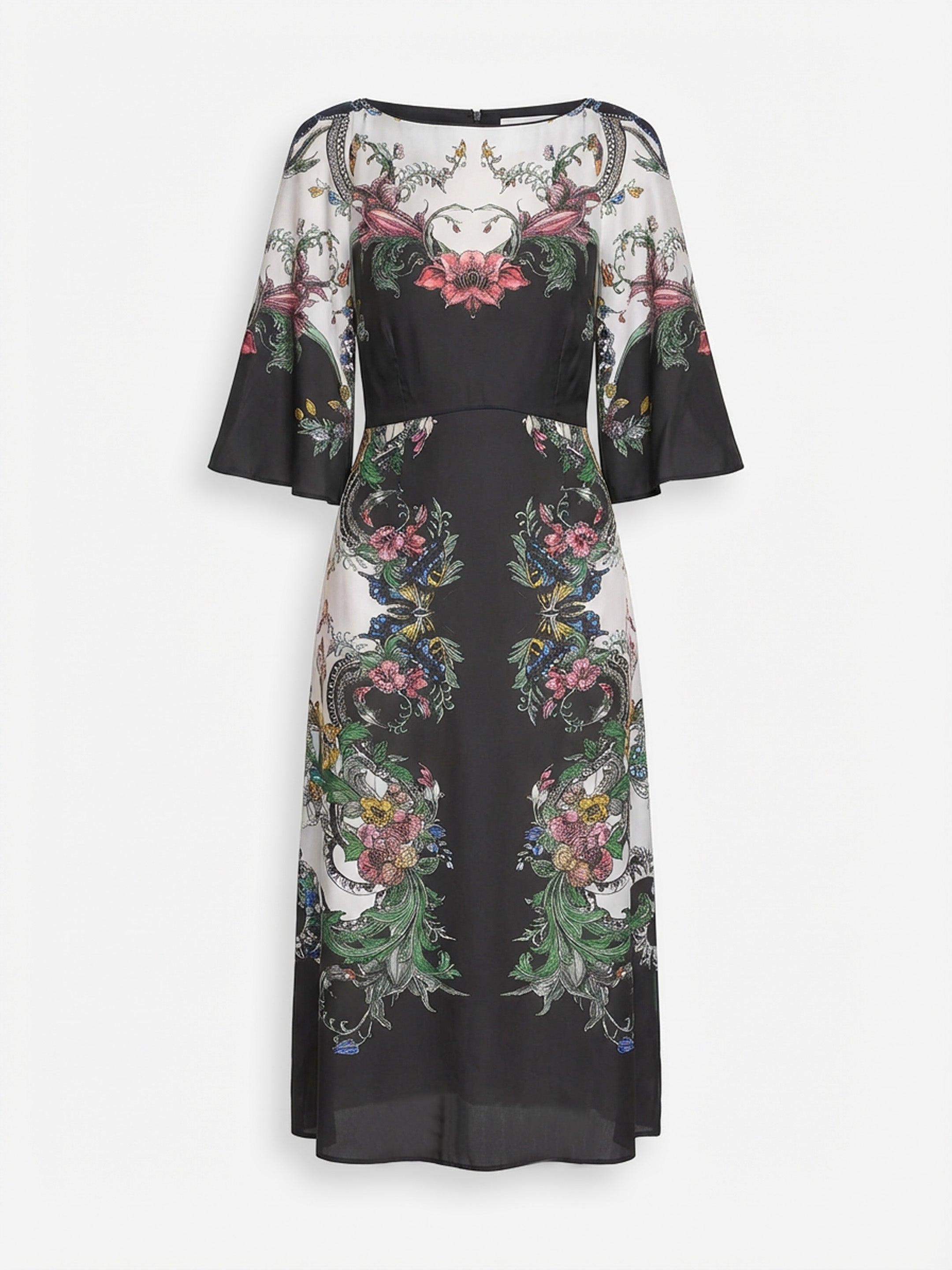 Crafted from viscose twill and chiffon with corded piping, the Billowy Twill Empire Dress features an empire A-line silhouette, high neckline, billowy sleeves, and finished with refined accent piping.