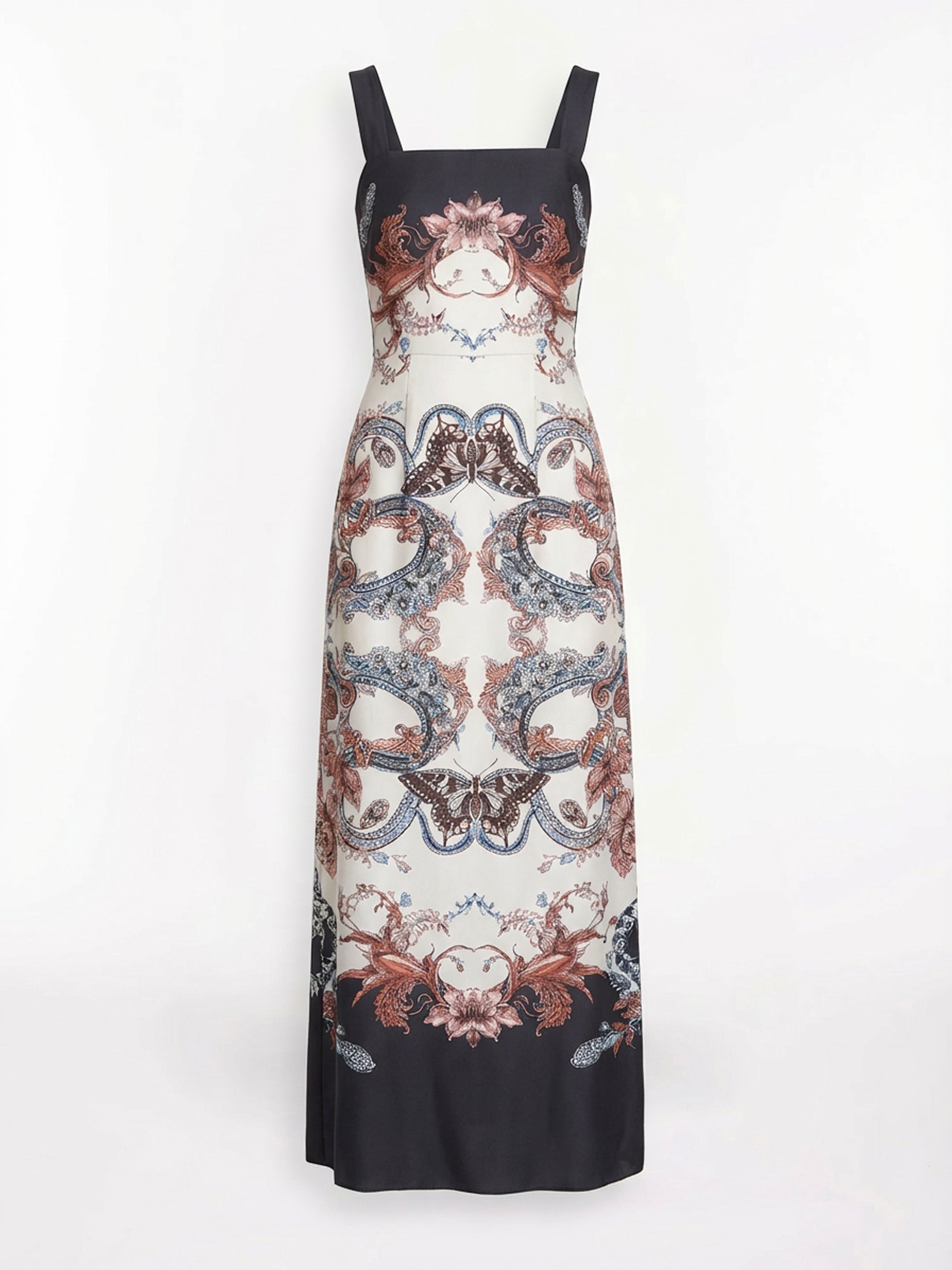 The Sleeveless Twill Midi Dress features a square neckline, side lacing, and back slit. Crafted from lightweight viscose twill, the mirrored patterned midi dress is detailed with chiffon corded piping for a refined finish.