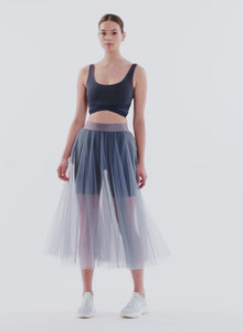 The Anne Skirt is a faultless tea-length addition to a layered look, featuring tiered weightless tulle, and a wide elastic waistband creating a high rise look. This is an extremely versatile garment; it is perfect for dance-related exercise, such as barre, or dance classes, and can also be worn as an everyday skirt, paired with running shorts or leggings. The sheer, tulle material and zen blue color adds a romantic and graceful element to this garment that extends its wear outside the gym.
