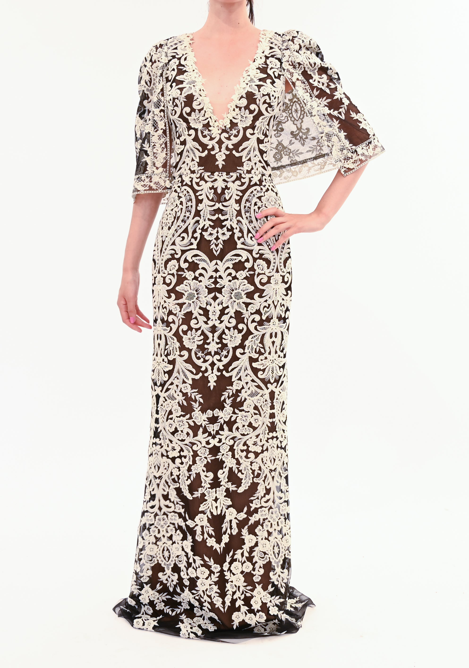 Soft cape sleeves frame a plunging V-neckline, intricately adorned with lace embroidery over sheer tulle. The fitted column silhouette features a thoughtfully placed details that enhance the form, while the floor-length design offers a graceful, refined and elegant profile.