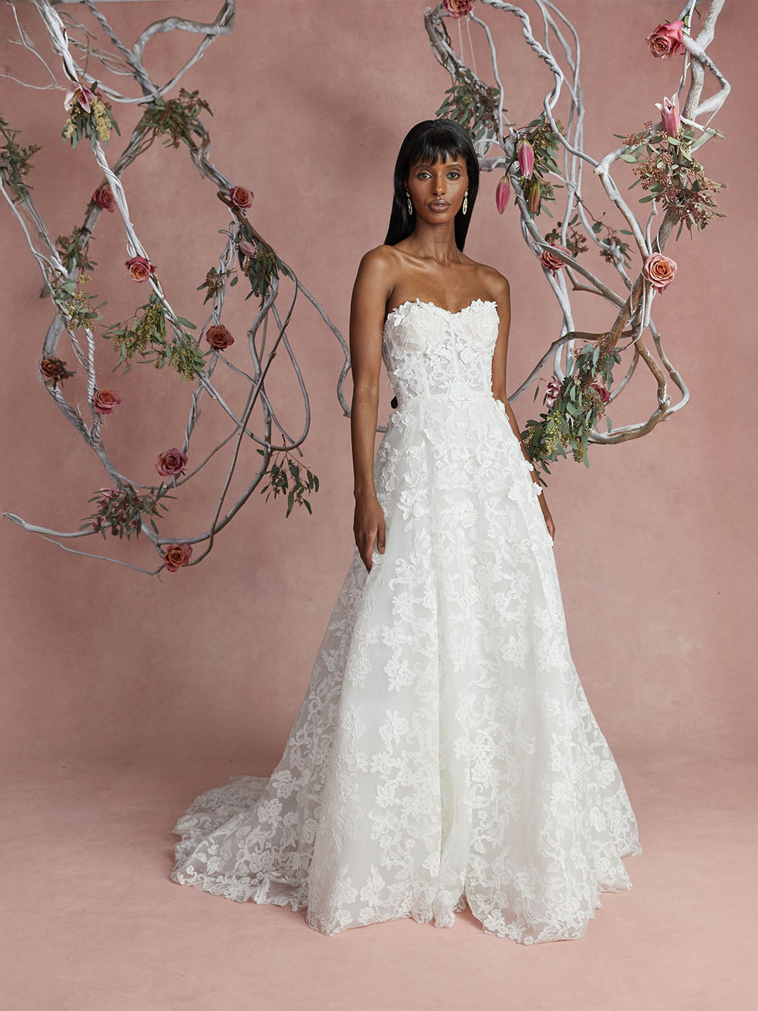 Strapless sweetheart neckline ballgown in corded lace with 3D flowers.