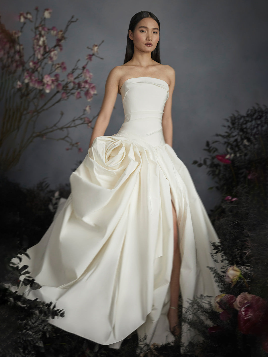 Strapless faille ballgown with skirt slit & dramatic floral skirt drape.