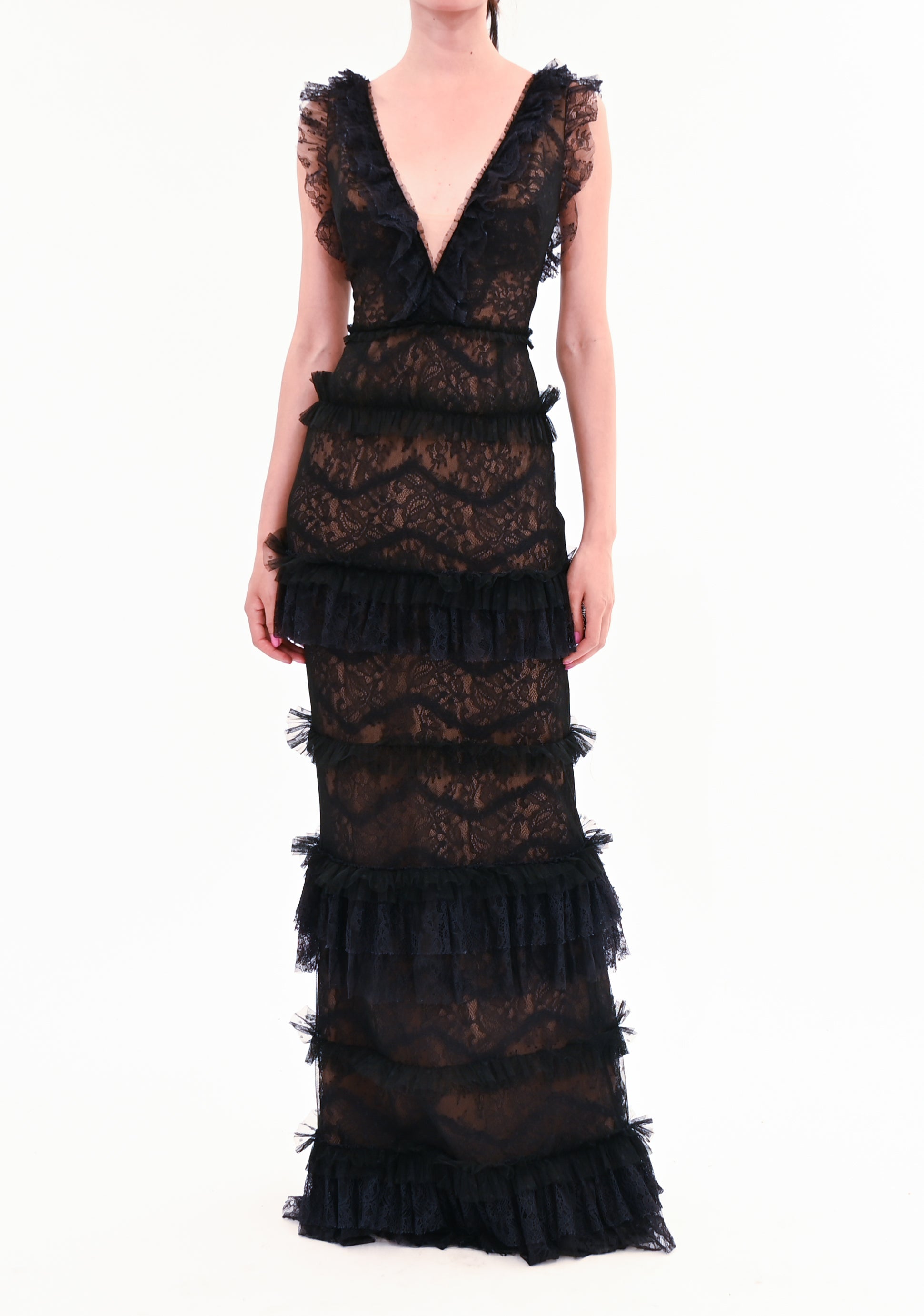 Crafted from exquisite Chantilly lace, this sleeveless column gown features a ruffled V neckline and a chevron pattern that gently contours the silhouette. The tiered long skirt brings softness and movement, resulting in an effortlessly elegant statement.